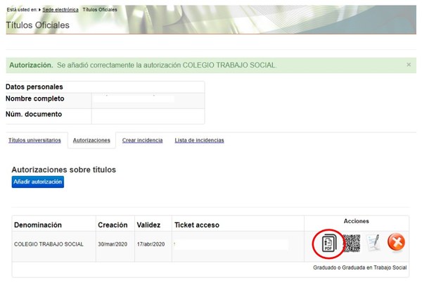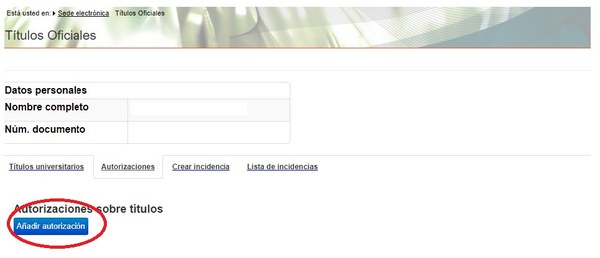 A continuació, es mostren les nostres dades personals i els nostres títols universitaris. Per crear el document que indiqui el codi de verificació per tercers haurem de fer clic a “Autorizaciones”.