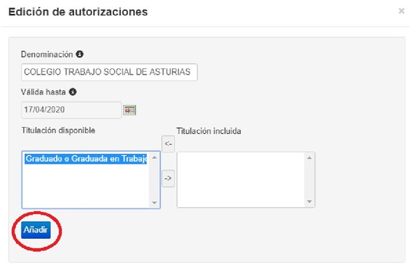 Omple la “Denominación” de l’autorització, és a dir, el nom de la entitat que confrontarà l’autenticitat del teu títol. Indica la data fins la qual serà valida aquesta autorització. Selecciona la “Titulación Disponible” i fes clic a la fletxa “->”. Per últim, fes clic al botó “Añadir”.