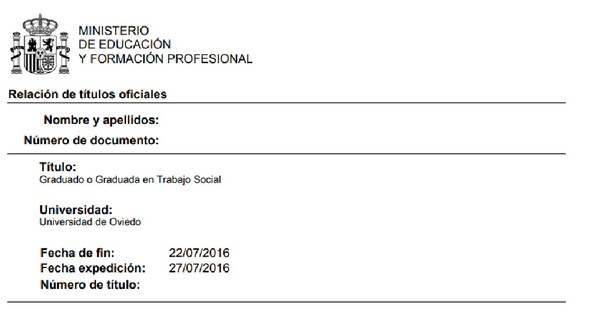Si descarreguem el document en PDF, apareixeran les nostres dades i la titulació que consta als arxius del “Ministeri de Educación”. A més, al final de la pàgina, apareixeran les dades de la entitat, l’enllaç de verificació i el codi a introduir per verificar l’autenticitat del teu títol universitari.