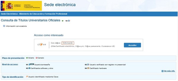 El “Ministerio de Educación”, mitjançant el servei gratuït “Consulta de Titulos Universitarios”, permet consultar els títols oficials espanyols dels quals ets titular i, si ho desitges, generar un codi d’autorització per a que tercers puguin consultar aquesta autenticitat.