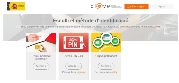 Fem clic a “Acceder” i seleccionem el mètode d’identificació (DNIe o certificat electrònic, la Cl@ve Pin o el sistema de Cl@ve Permanente).