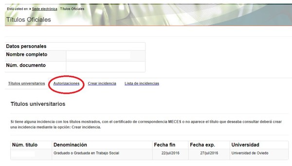 A continuació, es mostren les nostres dades personals i els nostres títols universitaris. Per crear el document que indiqui el codi de verificació per tercers haurem de fer clic a “Autorizaciones”.